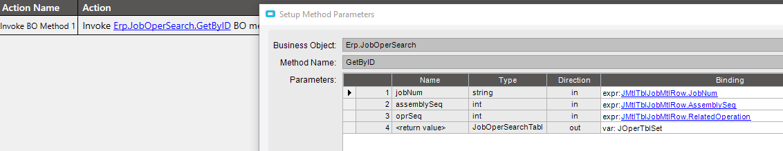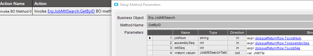 So I tried if tranqty changes then invoke JobMtlSearch BO, as I can link that to IssueMaterial. Aft that I invoke JobOpSearch BO. That worked fine, as I set it to send me an email with all the info. works perfect.