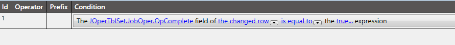 Lastly, IU put in the final condition, JobOper.OpComplete if the changed row is equal to true. This is where it breaks. It just doesn’t work.