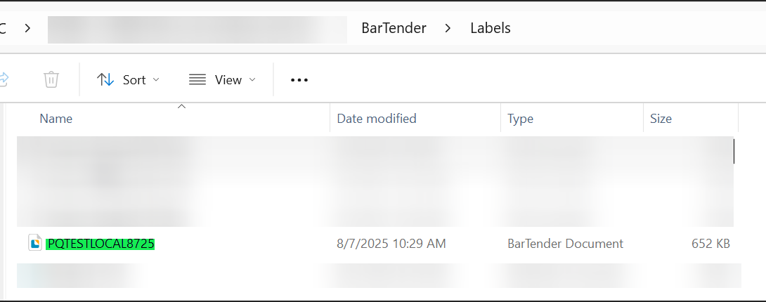 ( In File Explorer , whatever your bartender document name is needs to be input exactly as the name appears in your Bartender\Labels folder as shown below)