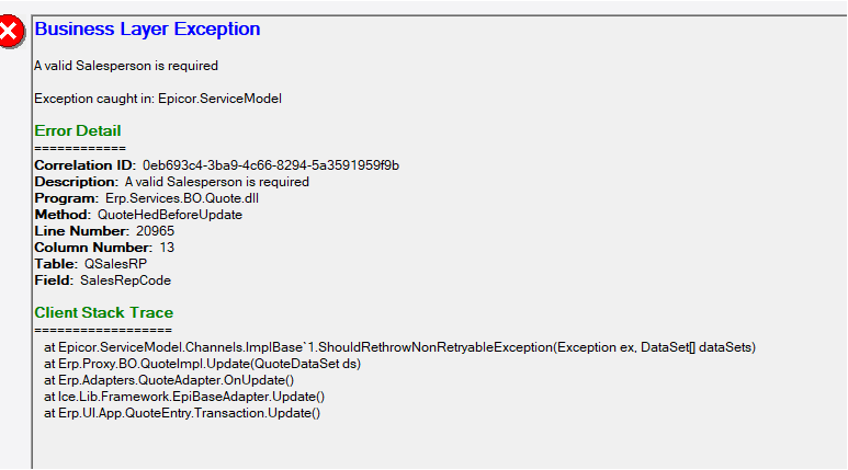 We recently had a Sales Rep leave and are now adjusting his name off of old quotes to the new person. While doing this we have run into an issue where we are getting an error (attached below) during the change. We can not do anything with the quote past this error but we can close it and re-open it and then make the change for the SalesRep.
