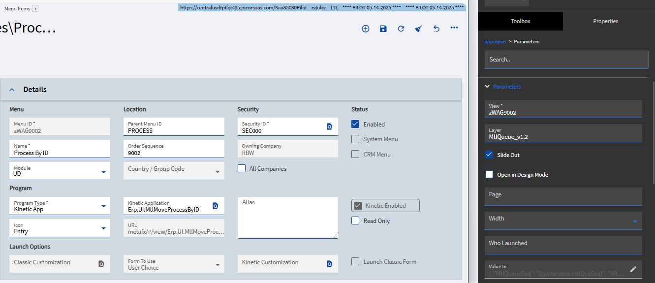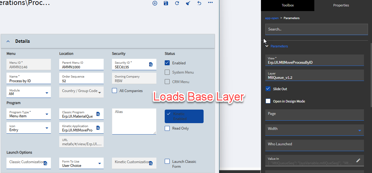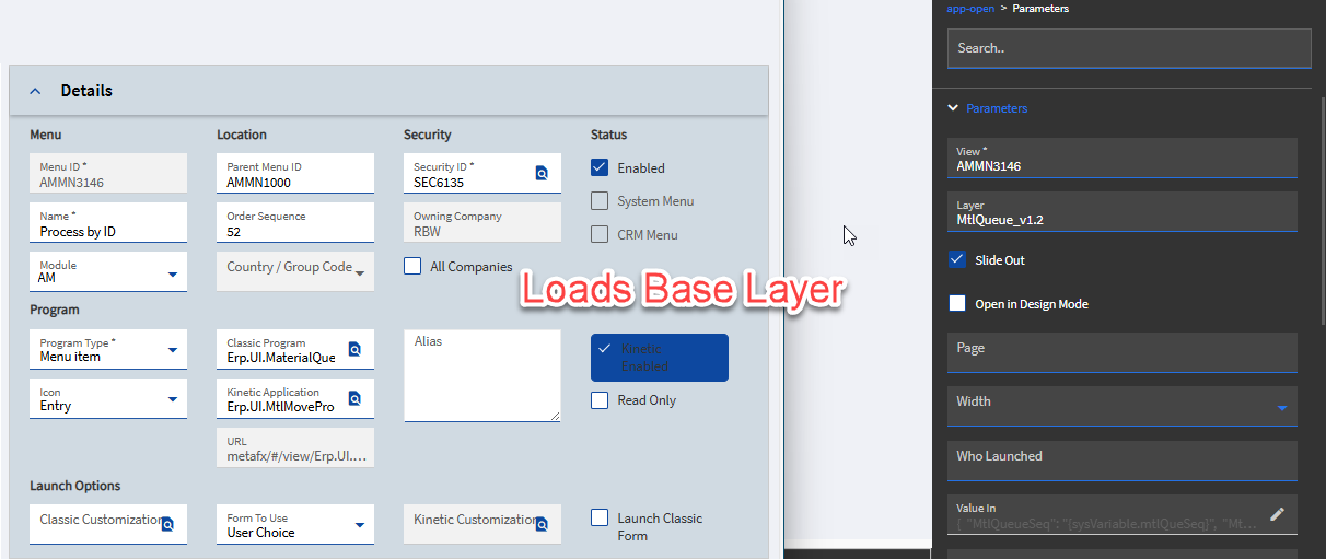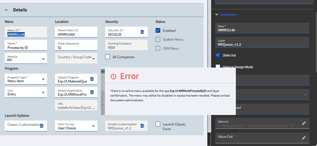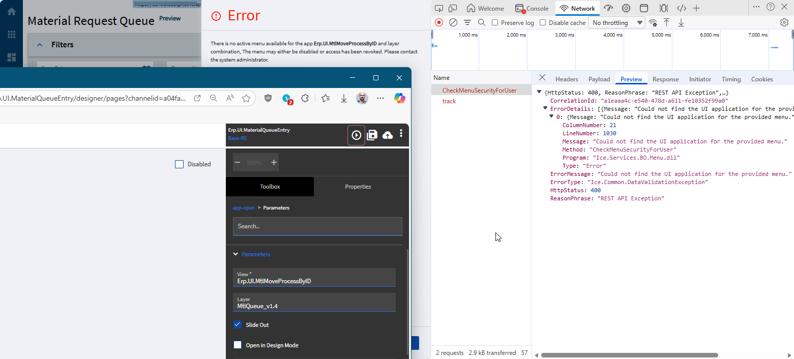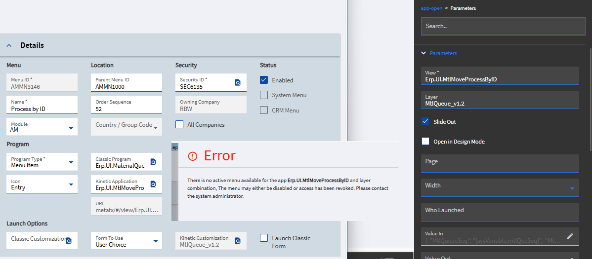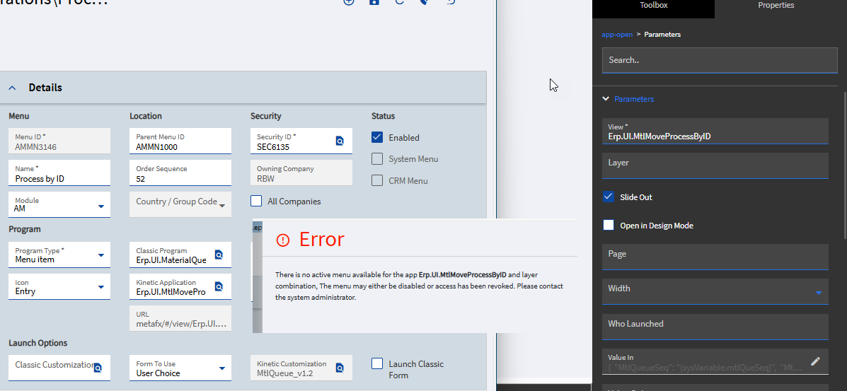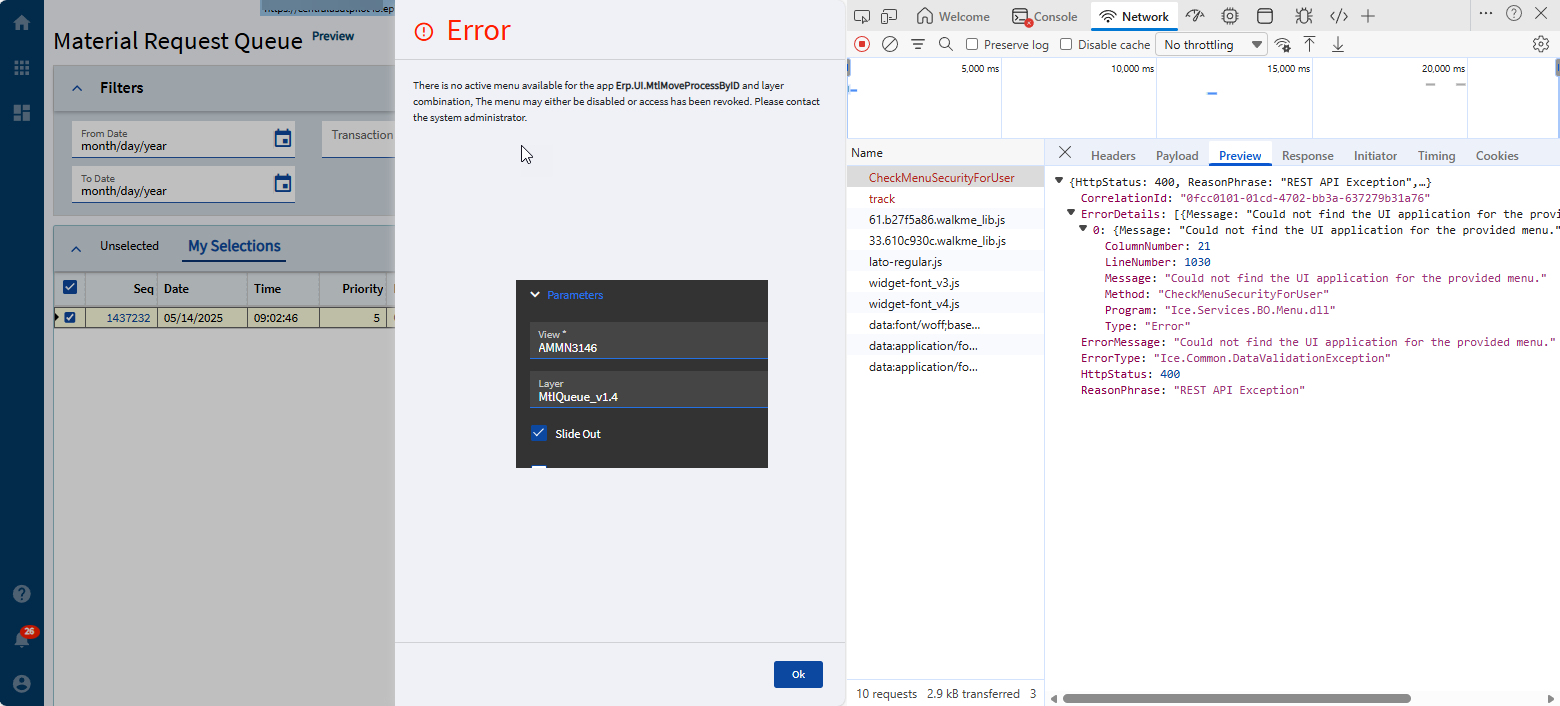 Our users want a custom layer in the Material Request Queue “Process” button slider. I got the layer setup no problem but when I try to apply it to the MRQ I’m getting this error trying to open a custom layer: