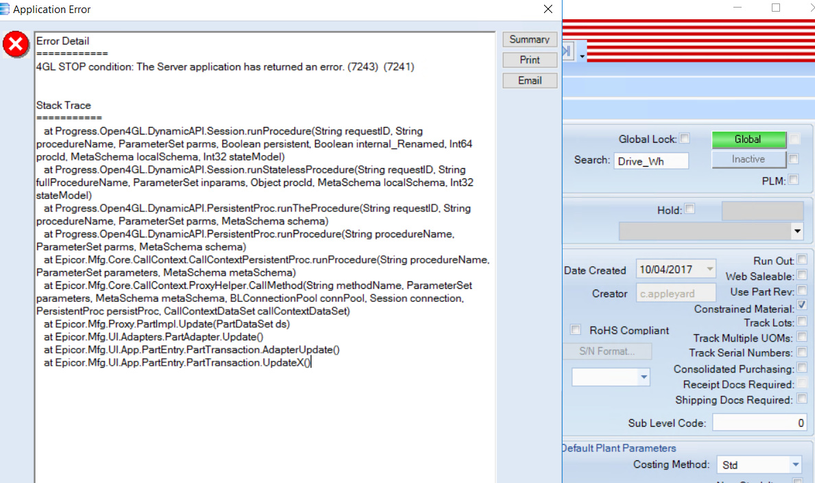 Message: Part W4710 does not exist create? Select yes You will get a commodity code error click yes. When the part screen comes up delete the commodity code (near bottom left) then click save. 4GL error occurs.