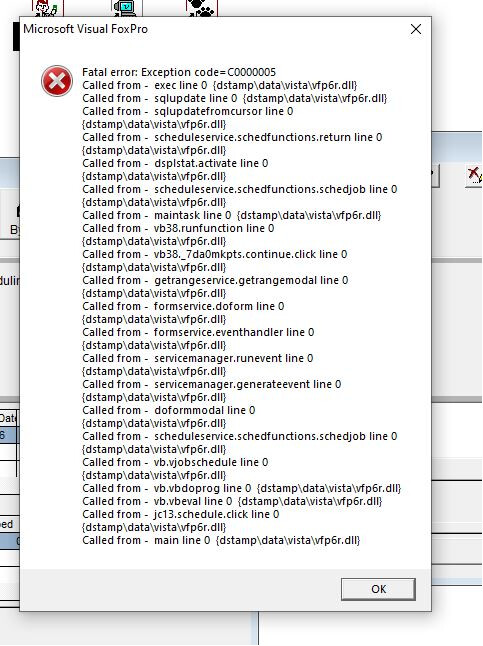 I did a search, and it seems that this is more of a “memory” error and could be one of many causes… when I did a google of Fox Pro and C0000005, I got multiple possible things. Here is one thread I found: C0000005 error and troubleshoot - Visual FoxPro | Microsoft Learn