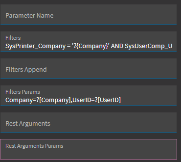 Filters: SysPrinter_Company = '?{Company}' AND SysUserComp_UserID = '?{UserID}'