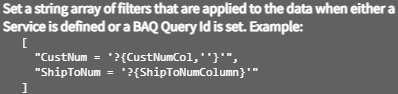 The Filters, Filters Append, and Filters Params inputs can be used with the BAQ Query options under the Advanced section.