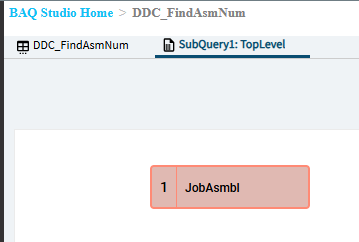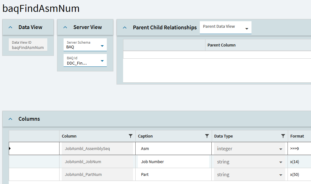 Initially I used this BAQ when attempting to get the FindAssembly method call to work. That method eventually failed me, but the BAQ is still useful (though, not critical to functionality). You can skip this if you want, but it ended up nice to have to create a warning if the user enters an assembly number that doesn’t exist on the job.