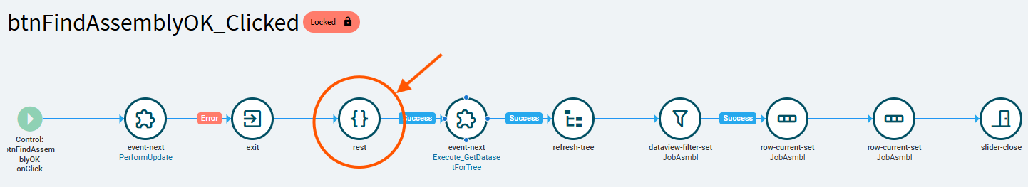 Again, I attempted to inject my own values into that rest call… and although it did work, it would only bring back the first assembly with the specific PartNum, NOT the assembly I was asking for. FindAssembly is hinged on the corresponding PartNum. The PartNum is the key to that method, so, ultimately it doesn’t work for our purpose. I therefore deleted the “rest” action from my event.