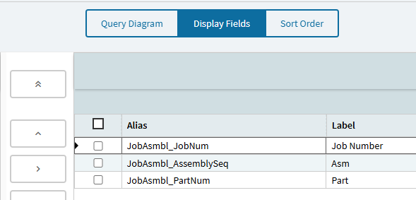 I’m going to query the JobAsmbl table so I can query a list of all assembly sequences for a particular job. And I only need JobNum, AssemblySeq, and PartNum: