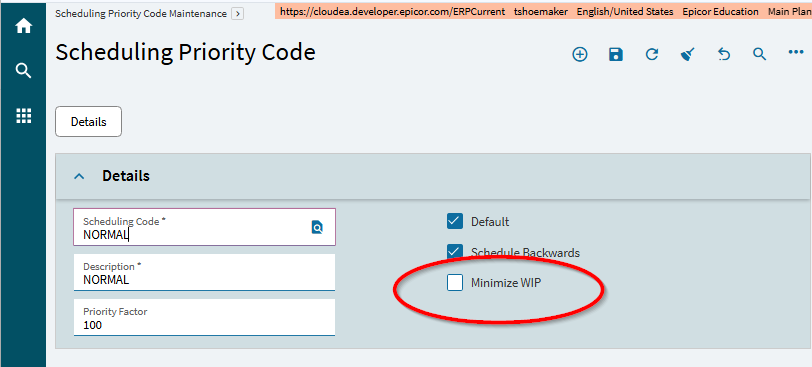 AH.. there is a “Minimize Wip” setting available in the Scheduling Priority Codes table… yours is probably turned off for your “normal” scheduling just like mine is. If you turn it ON, then after the system does a forward schedule (due to not allowing historical schedules), the system will do one final pass on the schedule, and will backward schedule it from the final finite capacity schedule.
