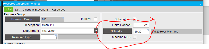 Tip: Do not enter more than 1 unless you typically set up more than 1 resource for the same operation on the same job. If you enter more than 1, operations scheduled in this resource group will use more of the available capacity. For example, a resource group with 4 resources at 8 hours per day has a production capacity of 32 hours and a work day of 8 hours. If you enter a 2 here, a single operation will be scheduled for 16 hours in a day (using 2 resources) instead of just 8.