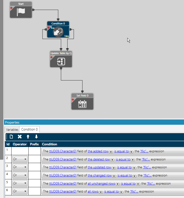 If I run my BPM with no conditions, it works. (my counter) . But when I put a condition in there, it won’t work You can see it can’t do anything but go through the rest of the steps after the condition (because both true and false go to the next step), and the condition should come back true anyways because I have all of the possible rows set up with an or clause. Can anyone tell me what I could be doing wrong where the condition would stop the BPM from working?