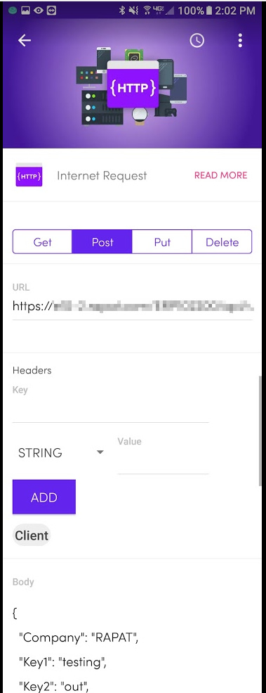 I was able to use the API/help for rest connected to our 10.2 test system from a browser. I added a row to UD09 using the “try it” button from swagger. Cool! Now I want to be able to do the same thing with the Flic App. In the UI there is a selection for get, post, put and delete. I’m using post. The next line is for URL, and I can grab that from the Swagger help.
