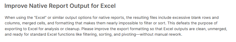 It would be nice if they developed dedicated excel only versions of certain reports, particularly in the GL reports area (I don’t see much value in a Sales Order in Excel personally) but I also know they have the Financial Report Designer or similarly named thing so that is likely their defence on that front.