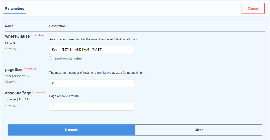 Using a REST service call in code, I’m struggling to pass a where clause with multiple parameters. The goal is to get a list of records that satisfy the where clause, and select the row with the highest “Key2” value.