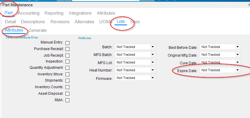 Then if you TRACK the Expire dates (in Part Maintenance/Lots/Attributes) I believe that you can change the expiration date of individual part/lots in the Lot maintenance program.