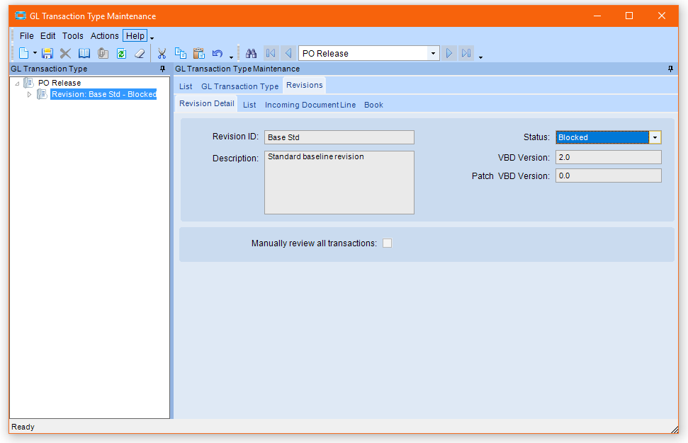I am trying to use the Get Suggestions menu to generate PO’s but every time i create one, i am presented with the error “Transaction Type PO Release was not found”. With a little digging i found the GL Transaction Type Maint. menu which showed our PO Release rev. as “blocked”. When i tried to change this i was presented with “the version of the document structure does not match the version code". The VBD version and Patch are 2.0 and 0.0 respectively. The error now makes sense since those numbers don’t match but what is Epicor expecting me to update? the PO report? Adding a new rev does nothing as it still pulls in the same VBD versions as mentioned above. Any ideas?