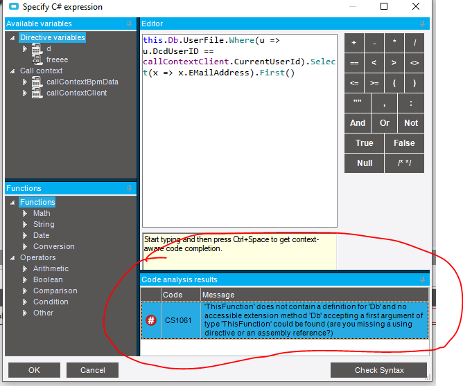 Other BPM’s where I use LINQ works fine, it’s almost like Functions do not have the same scope.