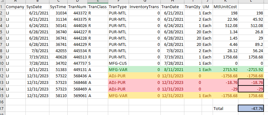 Here are all the the PartTran transactions on a job, which sum to -$47.76 (this is WIP, or difference from the job costs minus the value of shipped equipment).
