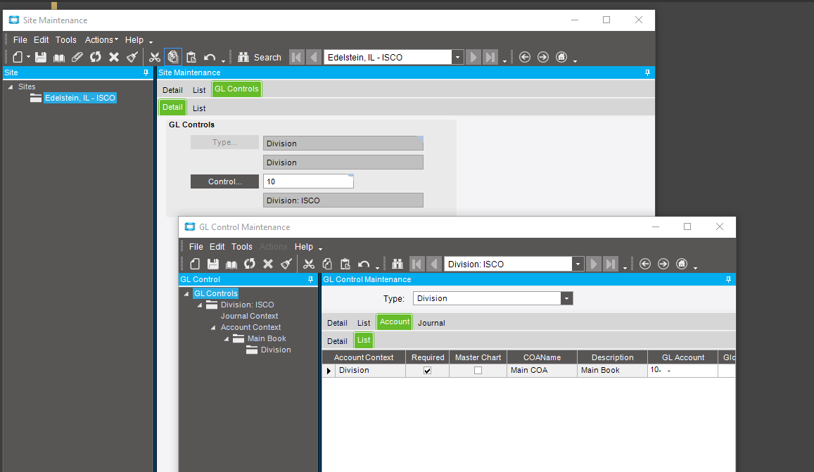 The documentation infers that I can add GL Controls in the Site Config screen. but when I try, there are no GL Control Types available. I can make the “Inv Cos & WIP” and “Division” GL Types available by adding “Plant Config” to as a Business entity in GL Control Type maintenance.
