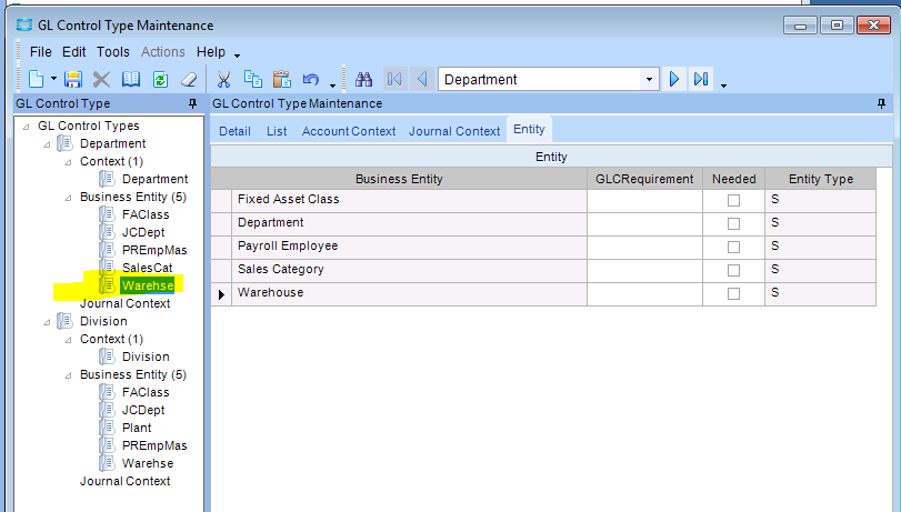 Then in the Warehouse Maintenance, add a GLC (type = “Department”), and select the GLC Code you created above. Repeat for each warehouse…