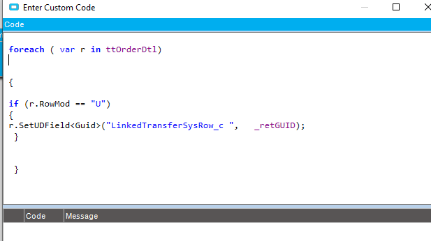 The code is r.SetUDField("LinkedTransferSysRow_c ", _retGUID);