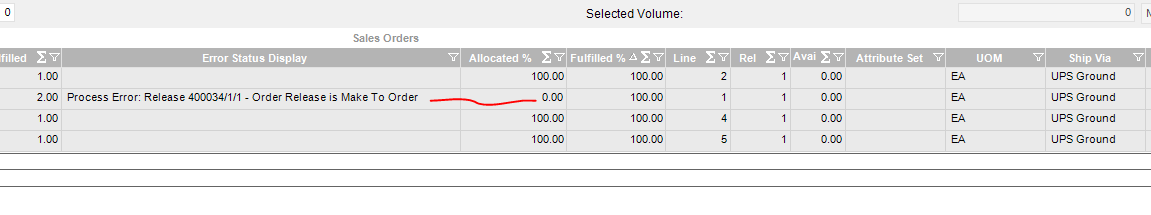 We have scenarios where we have customers ship us their product for us to perform a service, refill oils, etc. These are make to order line items at the sales order level. When the item is ready to be shipped, the user who lets the shipping department know what needs to be shipped uses the fulfillment workbench, allocates the order and prints the material queue report so they can pick/ship the correct products. At fulfillment workbench by order, the user is getting a process error after trying to allocate by part that indicates the order release is a make to order which prevents the order from being submitted to the material request queue for shipping to know what they need to ship.