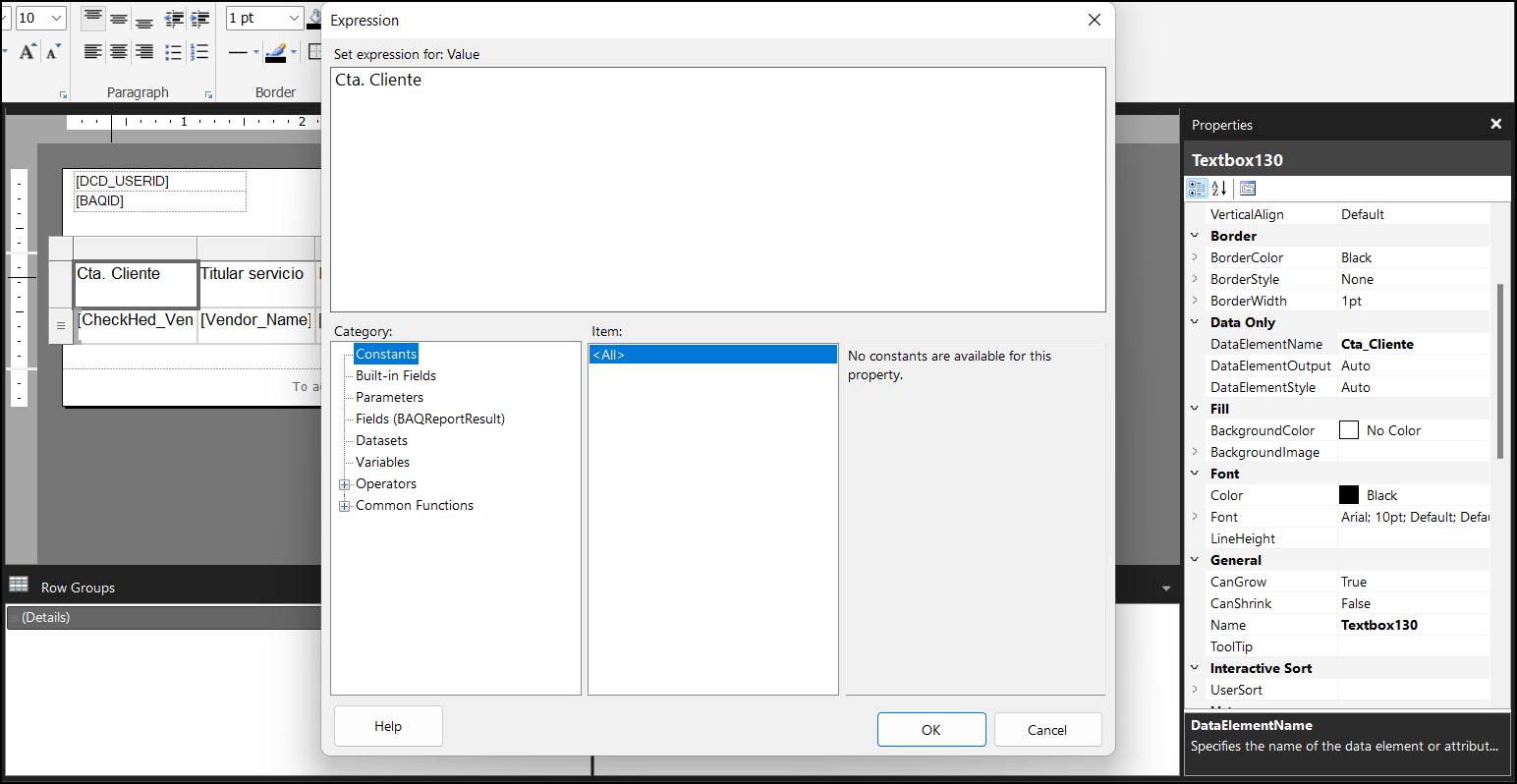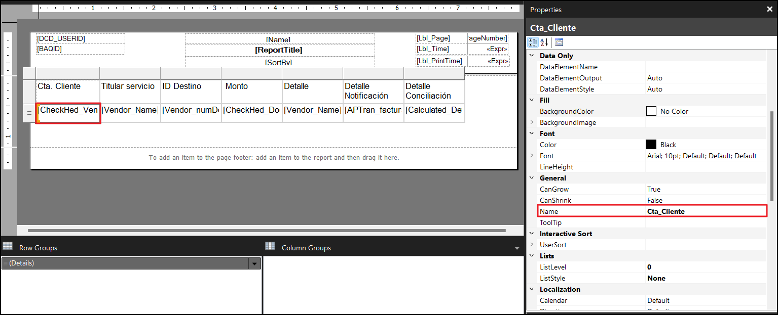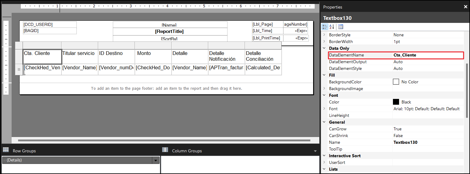 Try setting the DataElementName on this text box instead, rather than the header. It’s this name that’s being output currently, not the “Cta. Cliente” one.