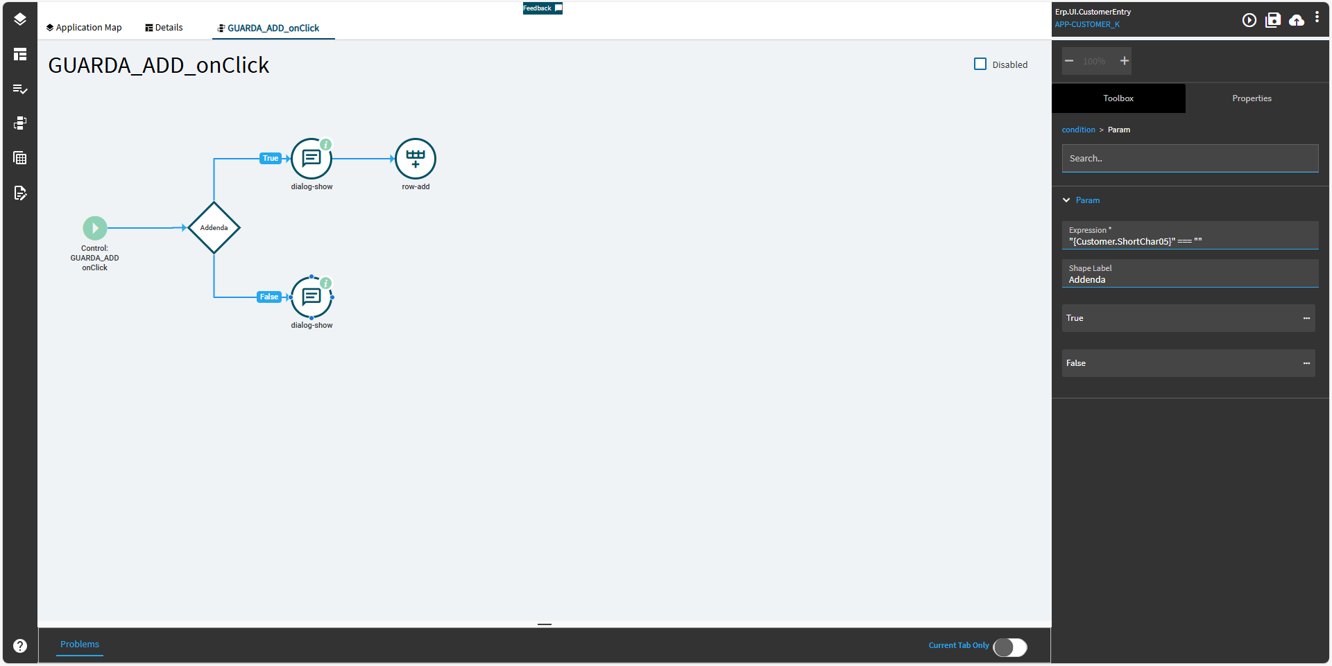 I’m customizing the customer screen where I added a button, and the condition is that if the ShortChar05 field is not empty, it should display a message and allow saving the information, but it’s not doing anything.