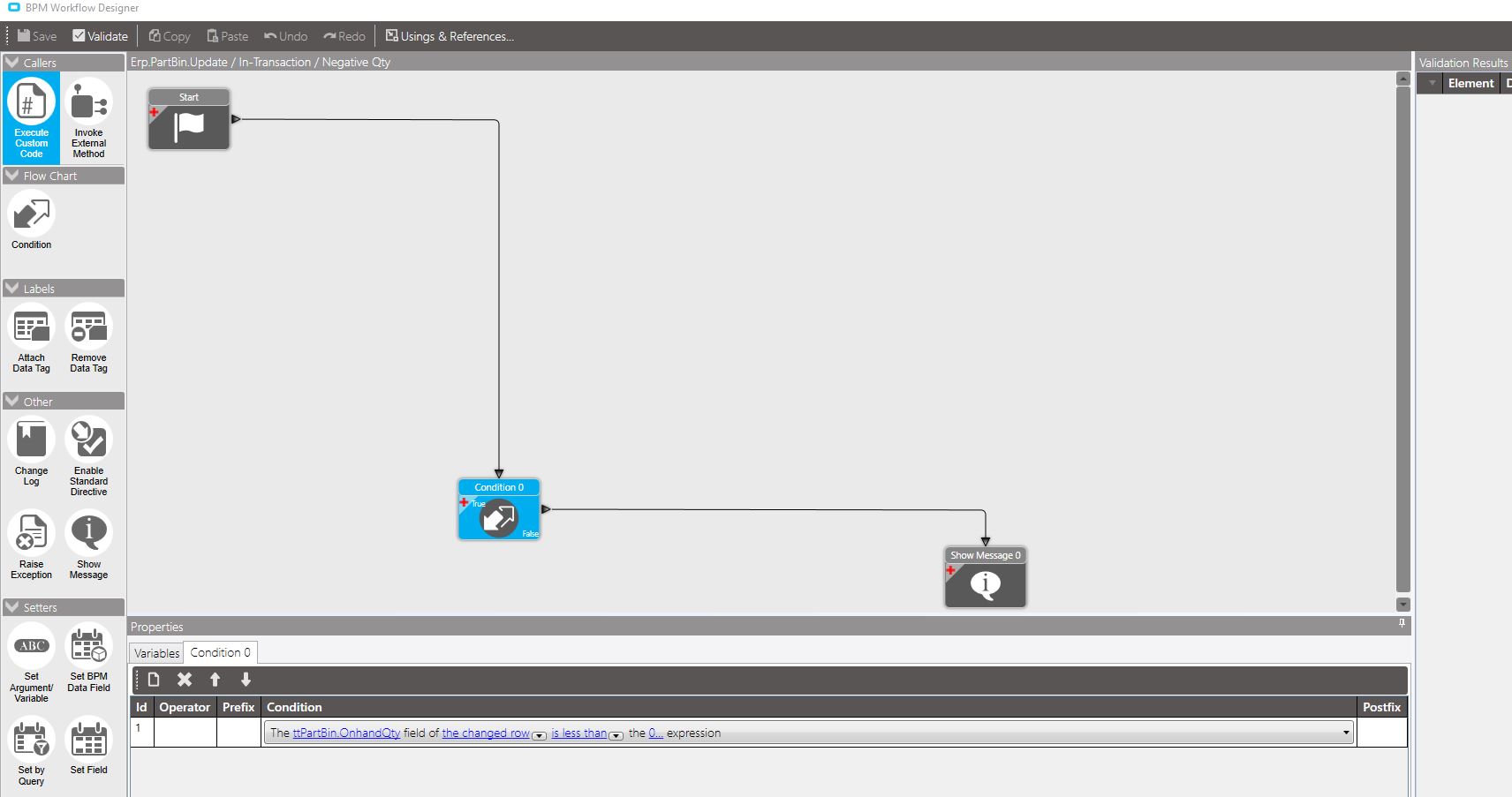 I am trying this out in our test environment. I am using an in transaction Directive and I am having it show a message when the condition is met. Picture of the BPM Workflow attached. the problem I’m having is that any time I do an inventory transfer the message appears. From my condition is should only show up when the qty goes below zero. Any idea what I could be doing wrong?