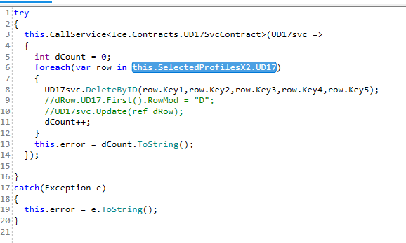 The code tries to access SelectedProfilesX2.UD17 but application studio is sending SelectedProfilesX2.SelectedProfilesX2 instead of SelectedProfilesX2.UD17