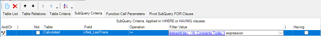 The Date itself comes from a calculated field (LastDate) in a subquery and I have tried and failed to create something that looks at > LastDate - 14 probably by bad syntax or something else I am not sure.
