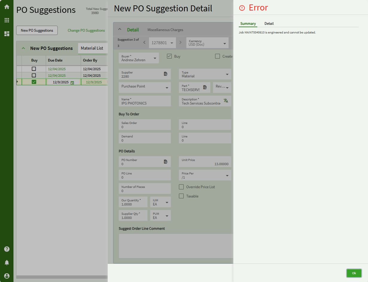 As you can see, this seems to marry up with the error you are getting. Due to the “feature” I described above, when you create a requisition for a Job material, the system will automatically added that part to the job once the PO is created. BUT… since you’re not allowing changes to Engineered jobs… ERROR time.