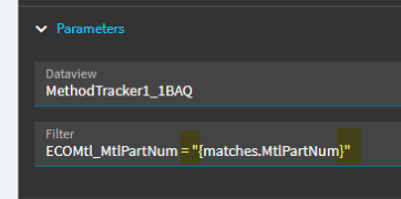 The filter should be ‘{matches.ECOMtl_MtlPartNum}’