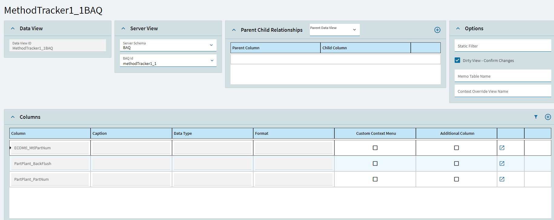 So, in my added column all of the checkboxes are checked. The BAQExecute results I am getting in the dev tools are showing the correct values are being returned. So the problem has to do with matching the BAQ view to the ECOMtl view I’d think. Do I need to me doing anything with the “matches” view to get the data into the ECOMtl view?