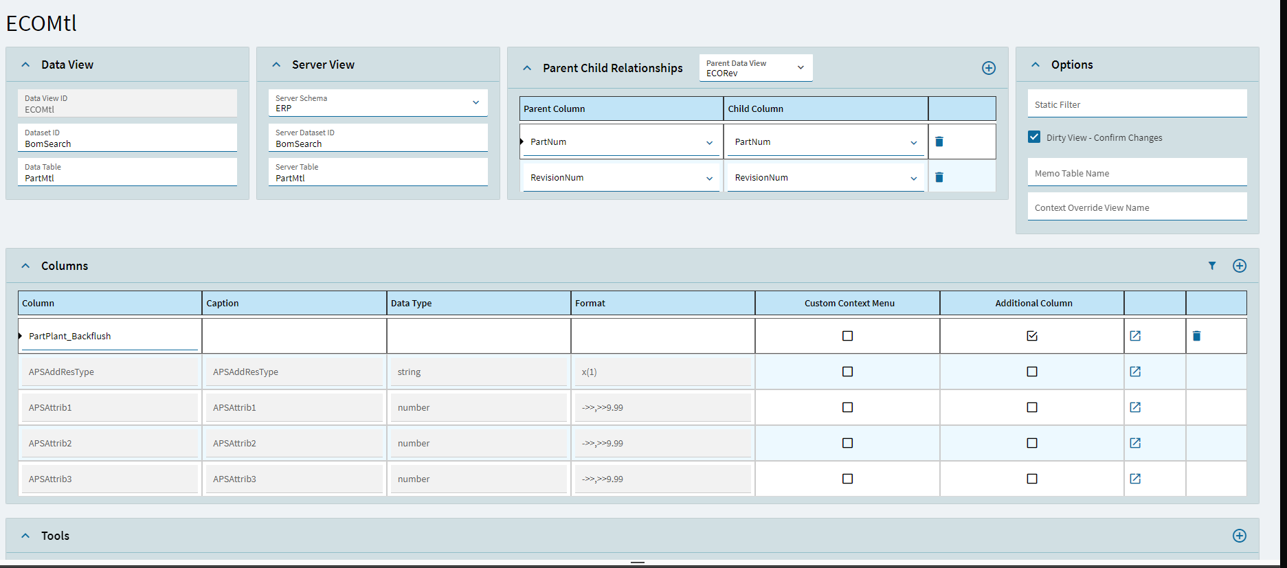 I’m trying to add PartPlant_Backflush to the ECOMtl view so that I can see if MtlPartNum has Backflush checked.