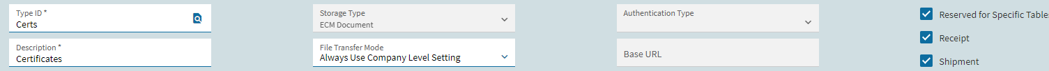 The first step is to create Document Types for whatever repository you are using with Document Type Maintenance. I am using ECM, but this should work for anything. I created a document type with a Certs ID. I also flagged it as Reserved for Specific Tables and required for Receipt and Shipment.