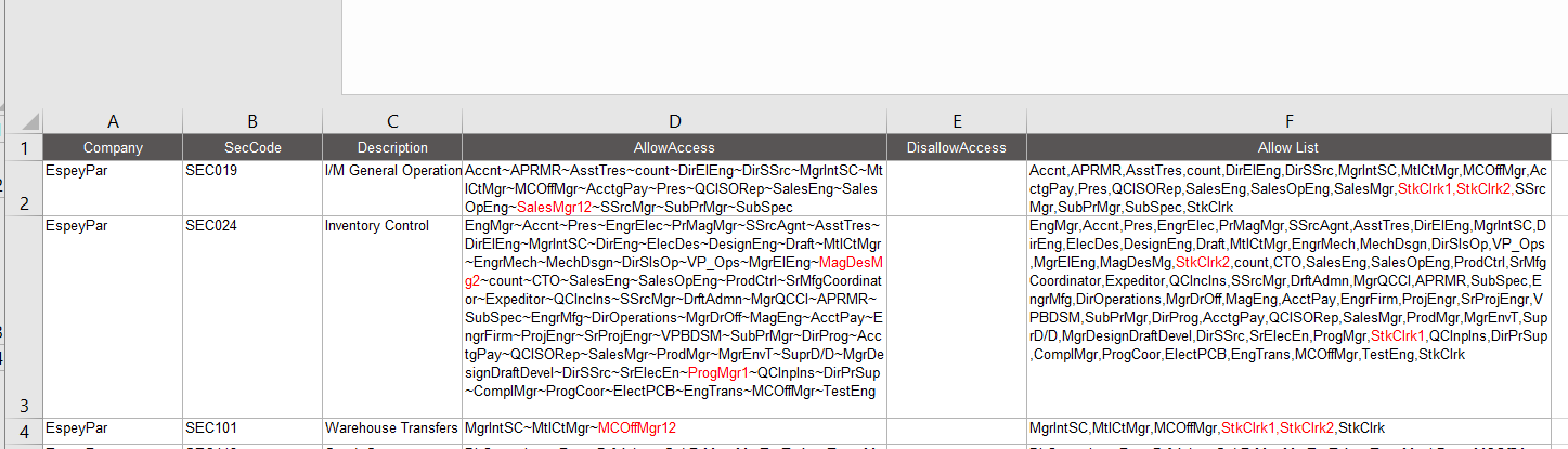 We have two security group codes StkClrk1 and StkClrk2 which do not seem to be converting correctly. They are missing from the AllowAccess column and the numbers 1 & 2 seem to be appended to other security codes. Below is an example of what we are seeing. I added the Allow List column to see what the data looked like before going through the calculated NewEntryList field.