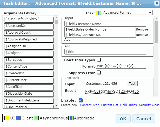 You assign a workflow to the content-type via the “Content Type Builder” and it should run through the workflow anytime that content-type is imported. I’m pretty sure that includes documents imported via Epicor (since you assign a content type to these as well anyway). Then you can OCR the data you want, and use some other “Tasks” to form the document name. Then you can use a “Advanced Format” task to set the title to whatever you need. We’re on an older version of DocStar, but here’s an example of setting a title. One of the “$Field”'s could be something you OCR.