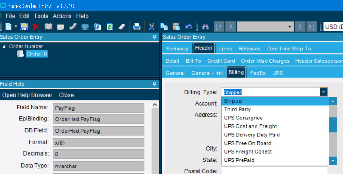 I need to exclude/hide the “UPS Consignee” option in the OrderHed.PayFlag field dropdown list that appears on the Order Header > Header Manifest Info > Billing tab in the Billing Type field.