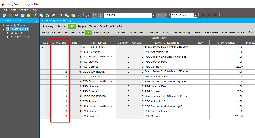 Then using a UD field at the line level, we enter the line group code. Finally, the modified form if it sees a ne line group will print this and not the documents line. Prices are total on the SSRS form.