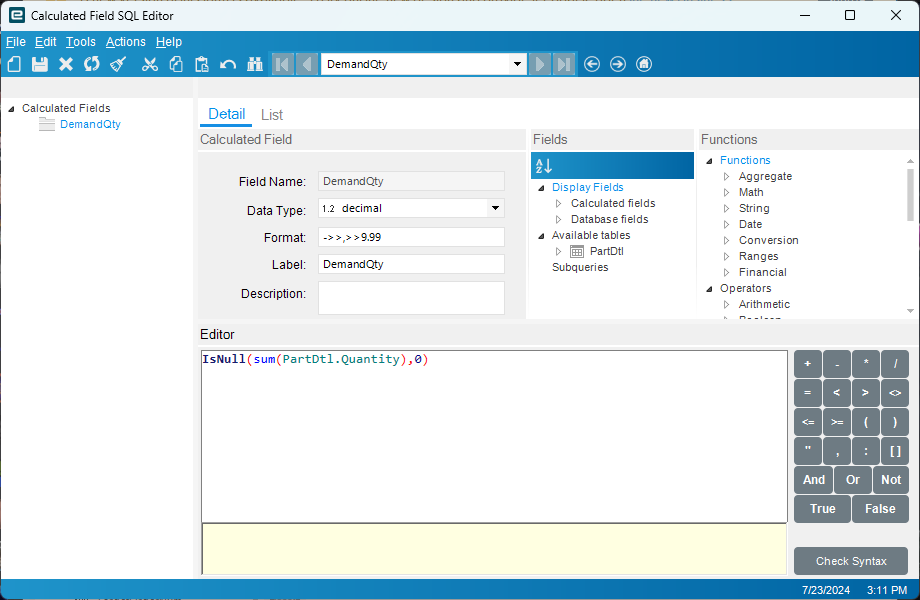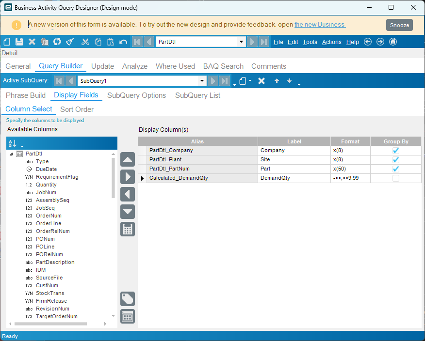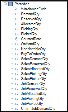 On the other hand, PartDtl is Time Phased (row per date/part combination), so you’ll want to summarize the results most likely. You’ll need to do a bit of Group By to get the totals you want.