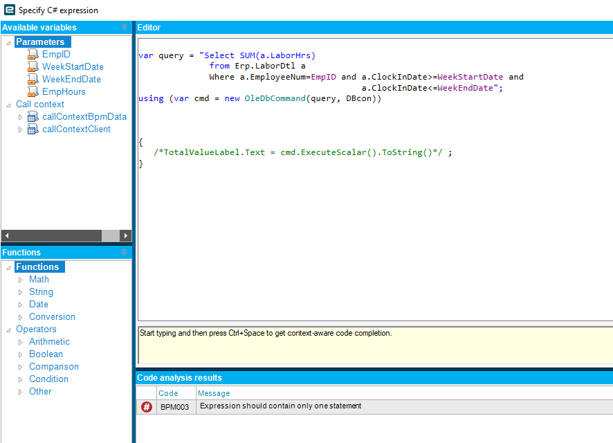 I am writing a Epicor function where I am passing a EmpID, StartDate and EndDate as a parameter. I need to return the SUM value of the LaborHrs column from the LaborDtl table by ranging on the EmpID and Date range. Please see the attached picture. Can someone help me writing the C# code or if any other way of achieving this.