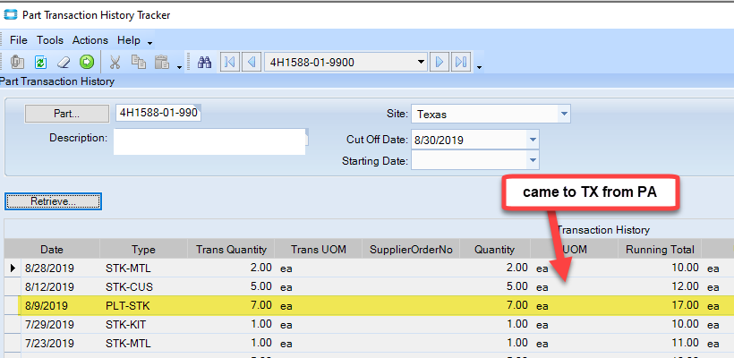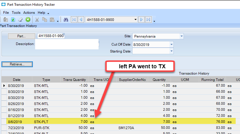 Your bottom part transaction history tracker looks fishy. It has transaction dates 8-16 with stk-plt 1 and -1 (sys date different). When we ship TO to we show positive trans qty (even though it’s reducing the running total). See below. I suspect you didn’t get any of it shipped.