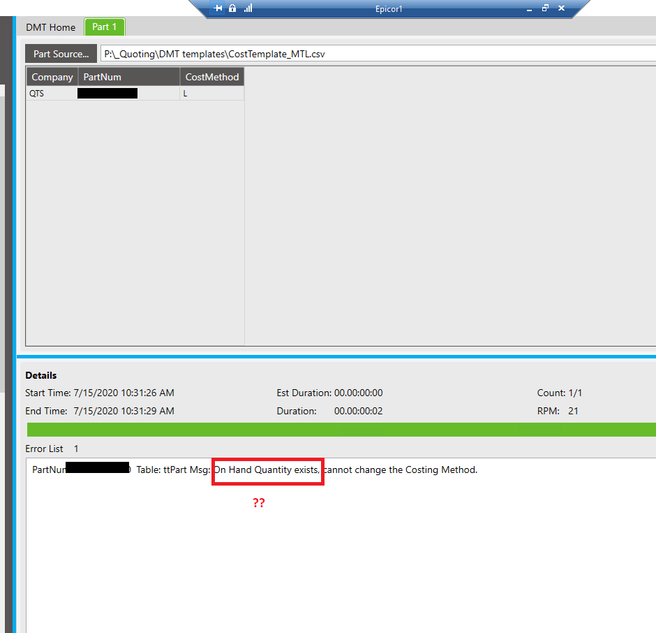 However, when I try to update using DMT, it tells me there IS qty on hand.