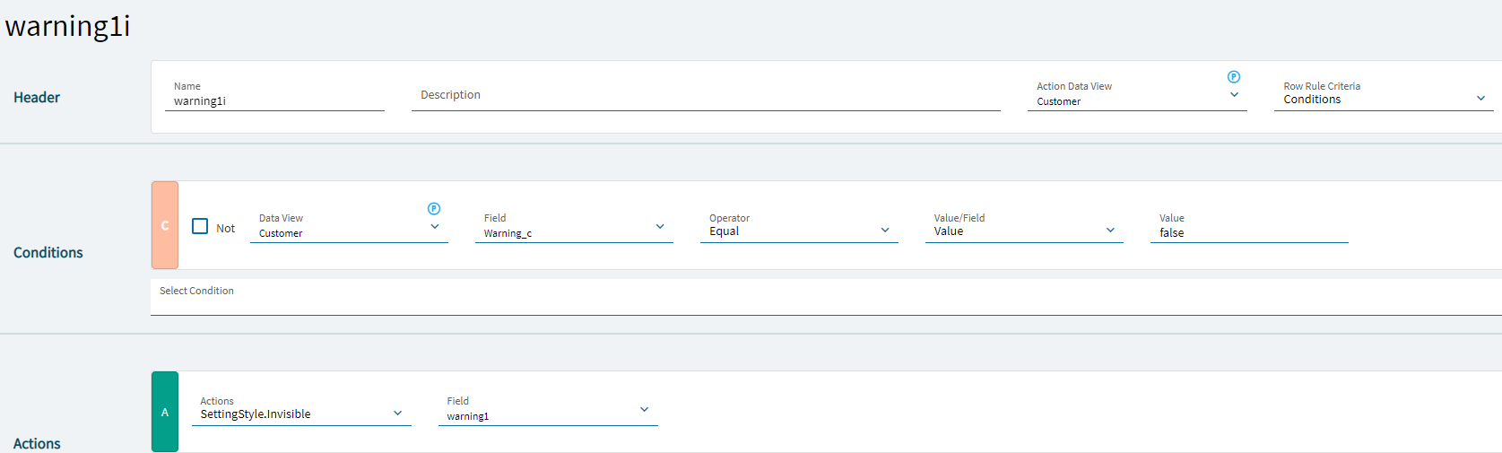 It will remain invisible until the Rule condition is no longer met. So for your rule, row-update > Customer.Warning_c = true would make it visible.