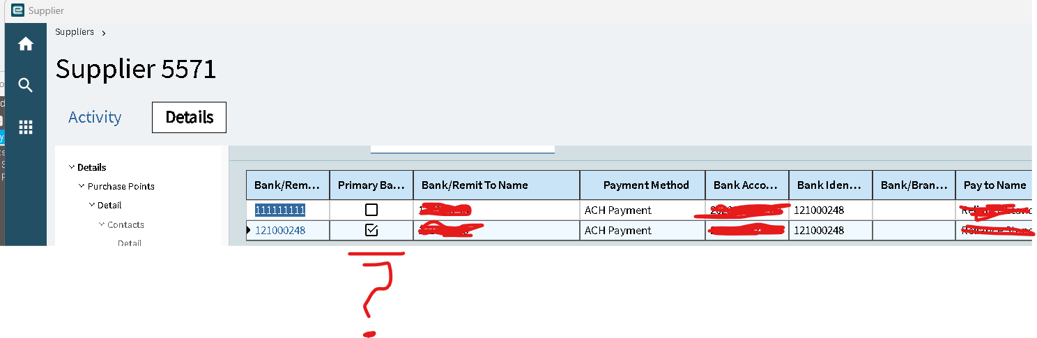 question on the suplier and the bank remit? the Primary bank check box should determine what record is used for the bank remit right? Anyone come across why this would not be and the non primary record would be used when there is more then one bank remit records?