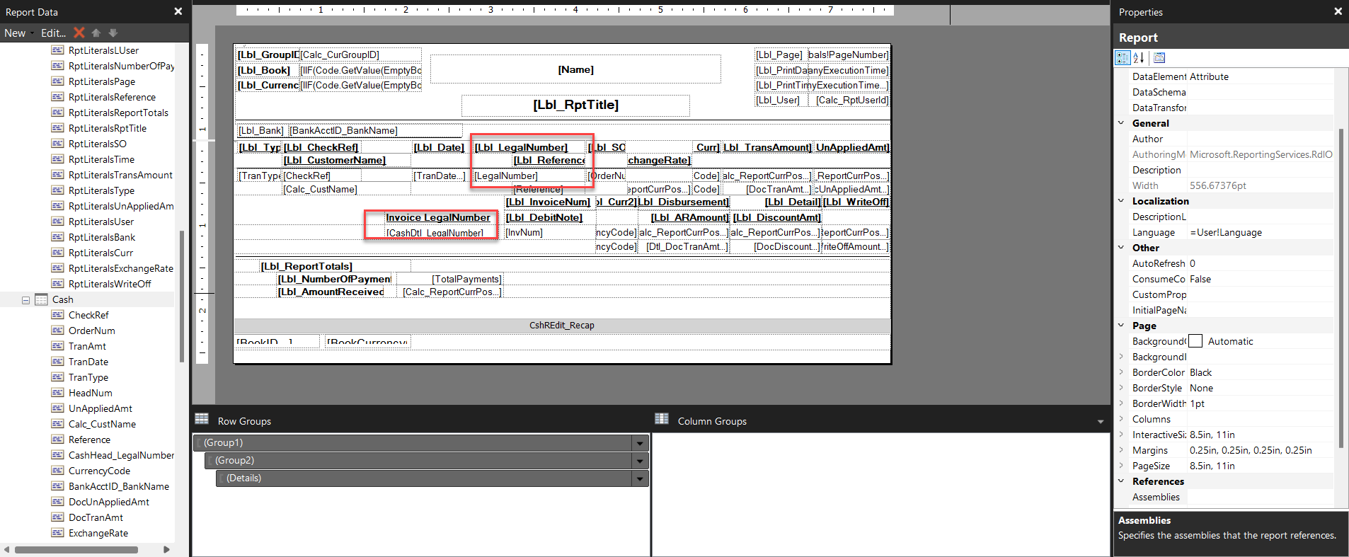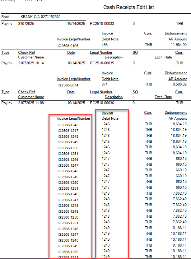 I want to extract the Invocation Legal Number data to display in the Cash Receipt Edit List report. The standard only has the Cash Legal Number.