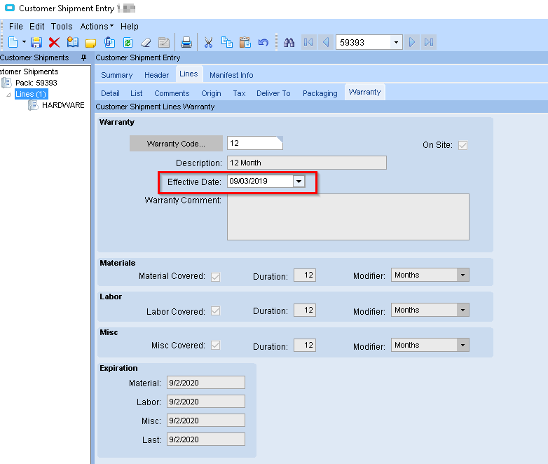 The warranty is assigned at the top level part when the pack is created. I’m not sure when it changed but you can now change the effective date for the lines warranty in the pack before it is shipped. I think it was around 10.2.100 or .200 when they added this feature.
