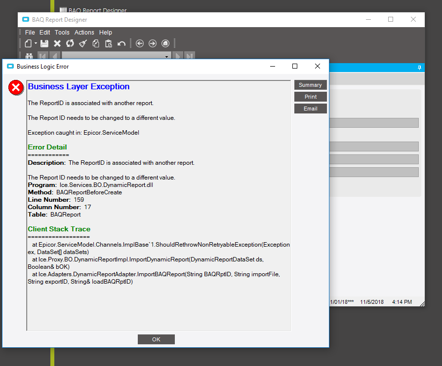 I am trying to import a BAQ Report and keep getting an error that states it is already associated. I have not other report with that name in the system. Any suggestions?