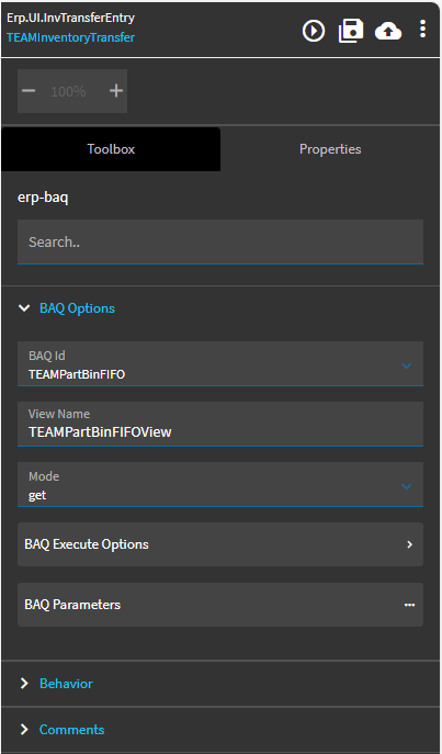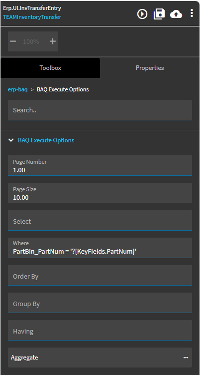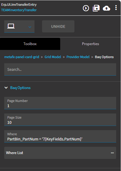 After the Transfer is made in the Inventory Transfer screen the data in these panel grids didn’t refresh so I added a custom event after the transfer event to get BAQ data. This worked for Transfer History since I was filtering at the query, however on the Part Locations panel grid it did not apply the filter above on the grid, instead it returned everything. So I tried adding a filter in the Where clause on the erp-baq get action but then the query did not return anything.